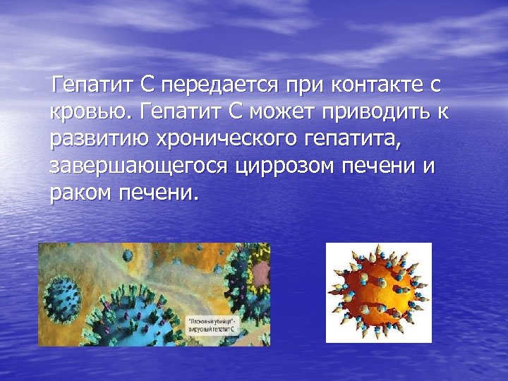 Гепатит С передается при контакте с кровью. Гепатит С может приводить к развитию хронического гепатита, завершающегося циррозом печени и раком печени.