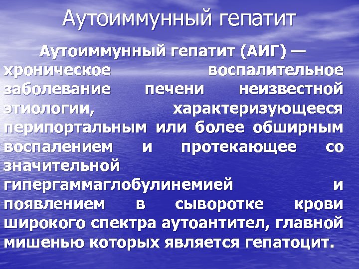 Аутоиммунный гепатит (АИГ) — хроническое воспалительное заболевание печени неизвестной этиологии, характеризующееся перипортальным или более обширным воспалением и протекающее со значительной гипергаммаглобулинемией и появлением в сыворотке крови широкого спектра аутоантител, главной мишенью которых является гепатоцит.