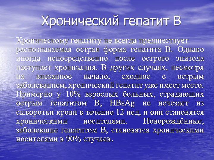 Хронический гепатит В Хроническому гепатиту не всегда предшествует распознаваемая острая форма гепатита В. Однако иногда непосредственно после острого эпизода наступает хронизация. В других случаях, несмотря на внезапное начало, сходное с острым заболеванием, хронический гепатит уже имеет место. Примерно у 10% взрослых больных, страдающих острым гепатитом В, HBs. Ag не исчезает из сыворотки крови в течение 12 нед, и они становятся хроническими носителями. Новорождённые, заболевшие гепатитом В, становятся хроническими носителями в 90% случаев.