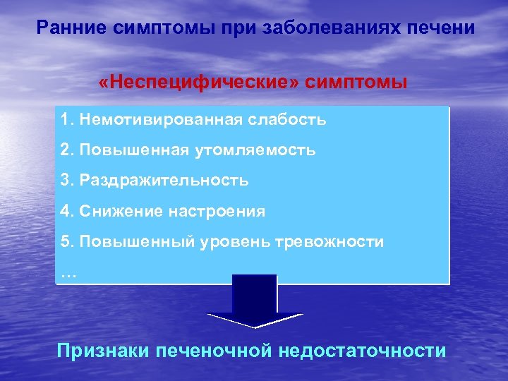 Ранние симптомы при заболеваниях печени «Неспецифические» симптомы 1. Немотивированная слабость 2. Повышенная утомляемость 3. Раздражительность 4. Снижение настроения 5. Повышенный уровень тревожности … Признаки печеночной недостаточности