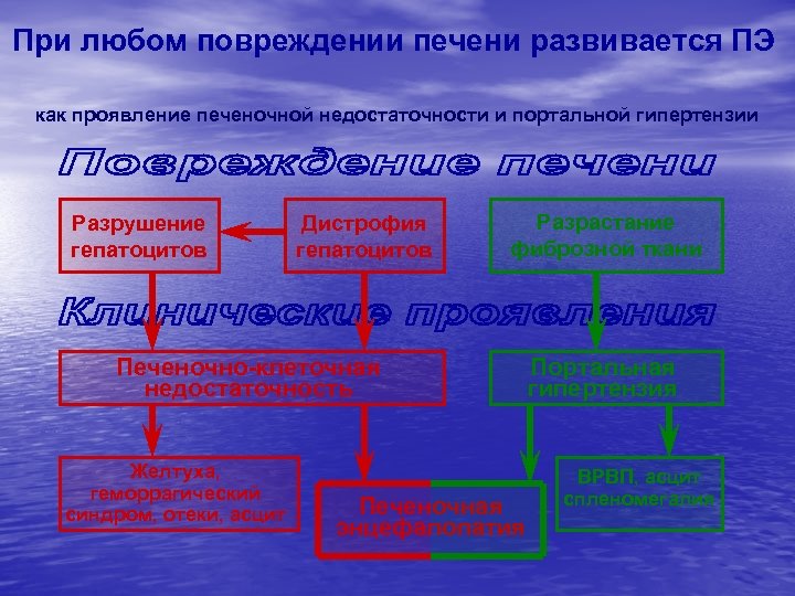 При любом повреждении печени развивается ПЭ как проявление печеночной недостаточности и портальной гипертензии Разрушение гепатоцитов Дистрофия гепатоцитов Разрастание фиброзной ткани Печеночно-клеточная недостаточность Желтуха, геморрагический синдром, отеки, асцит Печеночная энцефалопатия Портальная гипертензия ВРВП, асцит спленомегалия