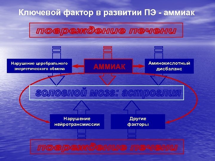 Ключевой фактор в развитии ПЭ - аммиак Нарушение церебрального энергетического обмена АММИАК Нарушение нейротрансмиссии Аминокислотный дисбаланс Другие факторы