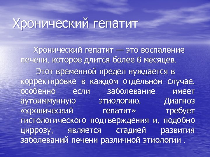 Хронический гепатит — это воспаление печени, которое длится более 6 месяцев. Этот временной предел нуждается в корректировке в каждом отдельном случае, особенно если заболевание имеет аутоиммунную этиологию. Диагноз «хронический гепатит» требует гистологического подтверждения и, подобно циррозу, является стадией развития заболеваний печени различной этиологии.