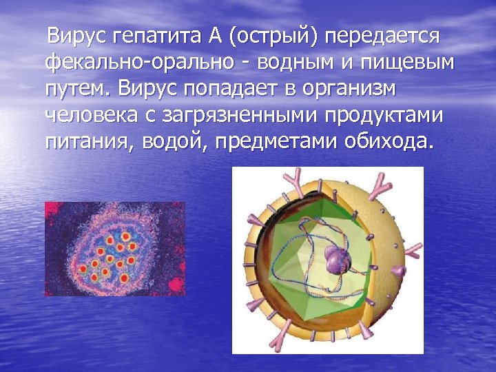 Вирус гепатита А (острый) передается фекально-орально - водным и пищевым путем. Вирус попадает в организм человека с загрязненными продуктами питания, водой, предметами обихода.