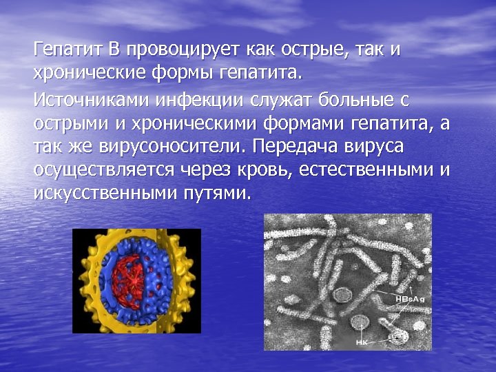 Гепатит В провоцирует как острые, так и хронические формы гепатита. Источниками инфекции служат больные с острыми и хроническими формами гепатита, а так же вирусоносители. Передача вируса осуществляется через кровь, естественными и искусственными путями.