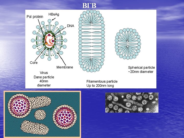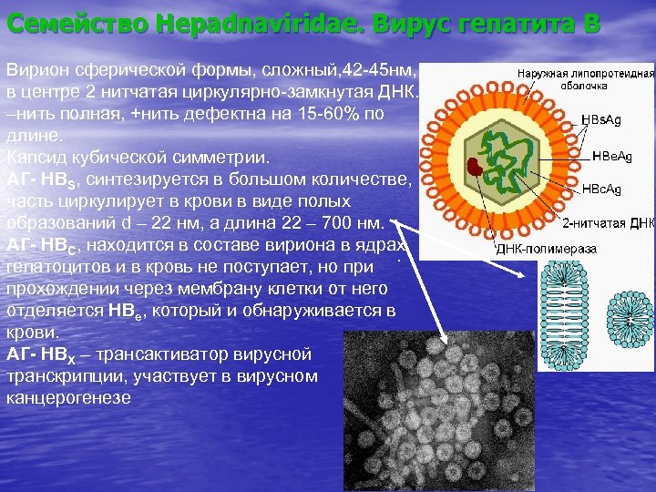 Семейство Hepadnaviridae. Вирус гепатита В Вирион сферической формы, сложный, 42 -45 нм, в центре 2 нитчатая циркулярно-замкнутая ДНК. –нить полная, +нить дефектна на 15 -60% по длине. Капсид кубической симметрии. АГ- HBS, синтезируется в большом количестве, часть циркулирует в крови в виде полых образований d – 22 нм, а длина 22 – 700 нм. АГ- HBC, находится в составе вириона в ядрах . гепатоцитов и в кровь не поступает, но при прохождении через мембрану клетки от него отделяется HBе, который и обнаруживается в крови. АГ- HBX – трансактиватор вирусной транскрипции, участвует в вирусном канцерогенезе