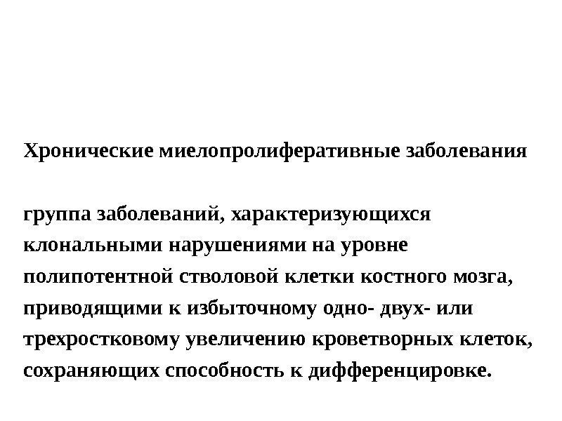 Хронические миелопролиферативные заболевания группа заболеваний, характеризующихся клональными нарушениями на уровне полипотентной стволовой клетки костного мозга, приводящими к избыточному одно- двух- или трехростковому увеличению кроветворных клеток, сохраняющих способность к дифференцировке.