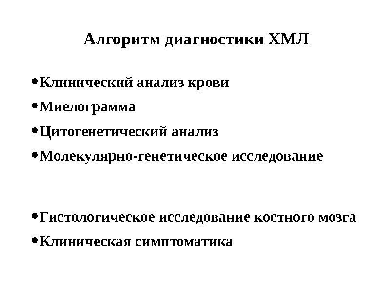 Алгоритм диагностики ХМЛ • Клинический анализ крови • Миелограмма • Цитогенетический анализ • Молекулярно-генетическое исследование • Гистологическое исследование костного мозга • Клиническая симптоматика