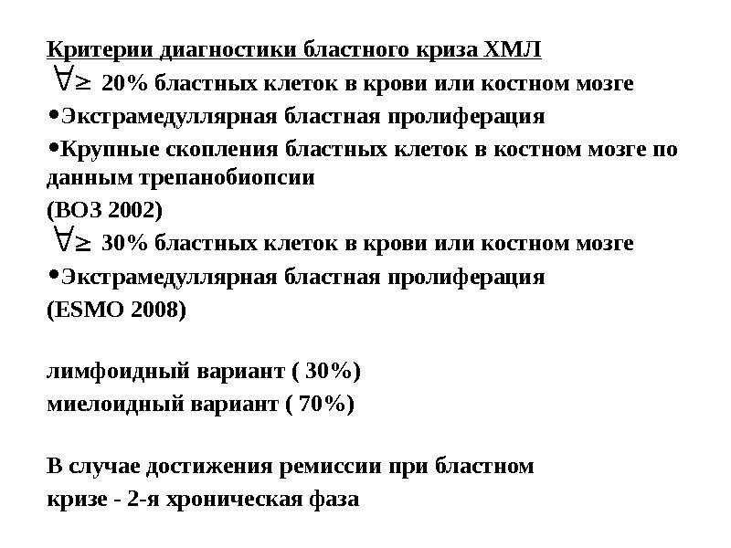 Критерии диагностики бластного криза ХМЛ 20% бластных клеток в крови или костном мозге • Экстрамедуллярная бластная пролиферация • Крупные скопления бластных клеток в костном мозге по данным трепанобиопсии (ВОЗ 2002) 30% бластных клеток в крови или костном мозге • Экстрамедуллярная бластная пролиферация (ESMO 2008) лимфоидный вариант ( 30%) миелоидный вариант ( 70%) В случае достижения ремиссии при бластном кризе — 2 -я хроническая фаза