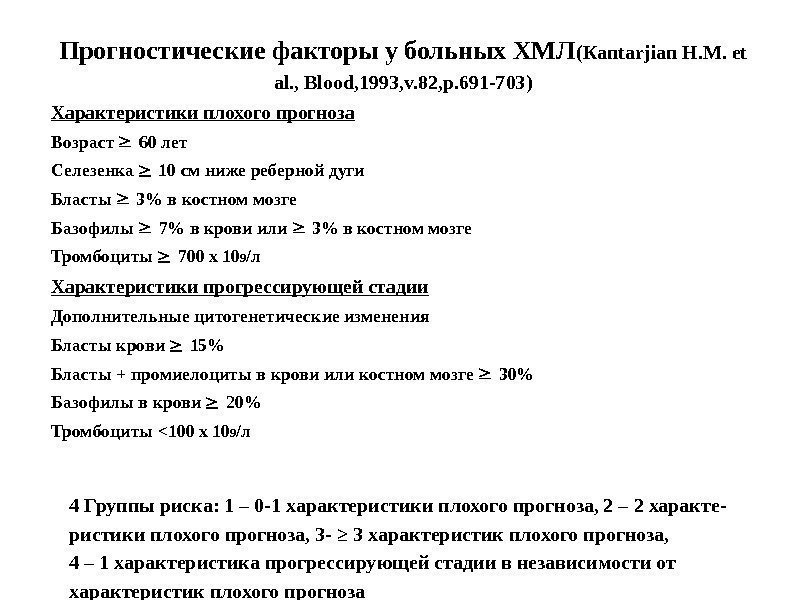 Прогностически неблагоприятные факторы • Возраст > 64 лет • Анемия (Hb 30000 в 1 мкл) • Лейкопения ( лейкоциты < 4000 в 1 мкл) • Появление бластов в крови ( 1%) • Цитогенетические нарушения (+8, 12 р-) 2 и более фактора — группа высокого риска с медианой выживаемости 2 года Отсутствие факторов (низкий риск) — медиана выживаемости 10 лет