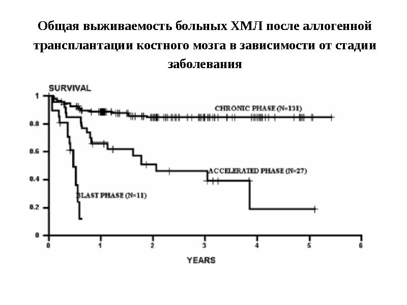 Общая выживаемость больных ХМЛ после аллогенной трансплантации костного мозга в зависимости от стадии заболевания