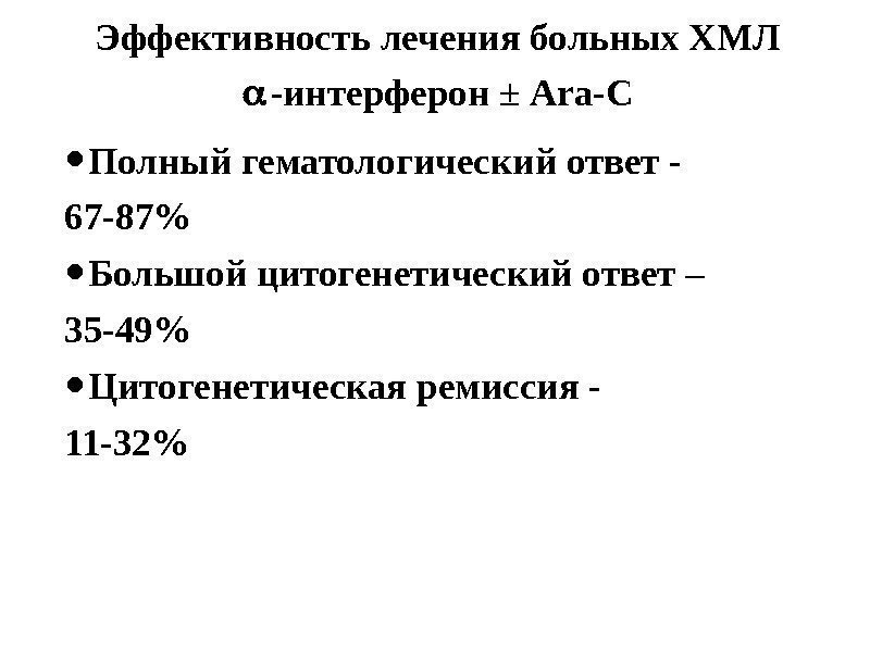 Эффективность лечения больных ХМЛ -интерферон ± Ara-C • Полный гематологический ответ — 67 -87% • Большой цитогенетический ответ – 35 -49% • Цитогенетическая ремиссия — 11 -32%