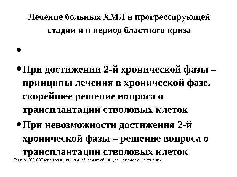 Лечение больных ХМЛ в прогрессирующей стадии и в период бластного криза • • При достижении 2 -й хронической фазы – принципы лечения в хронической фазе, скорейшее решение вопроса о трансплантации стволовых клеток • При невозможности достижения 2 -й хронической фазы – решение вопроса о трансплантации стволовых клеток Гливек 600 -800 мг в сутки, дазатиниб или комбинация с полихимиотерапией