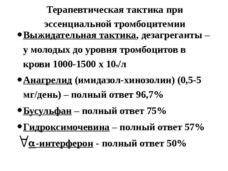 Терапевтическая тактика при эссенциальной тромбоцитемии • Выжидательная тактика , дезагреганты – у молодых до уровня тромбоцитов в крови 1000 -1500 х 10 9 /л • Анагрелид (имидазол-хинозолин) (0, 5 -5 мг/день) – полный ответ 96, 7% • Бусульфан – полный ответ 75% • Гидроксимочевина – полный ответ 57% -интерферон — полный ответ 50%
