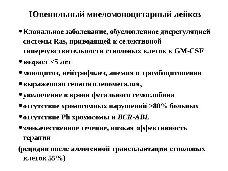 Ювенильный миеломоноцитарный лейкоз • Клональное заболевание, обусловленное дисрегуляцией системы Ras, приводящей к селективной гиперчувствительности стволовых клеток к GM-CSF • возраст 80% больных • отсутствие Ph хромосомы и BCR-ABL • злокачественное течение, низкая эффективность терапии (рецидив после аллогенной трансплантации стволовых клеток 55%)
