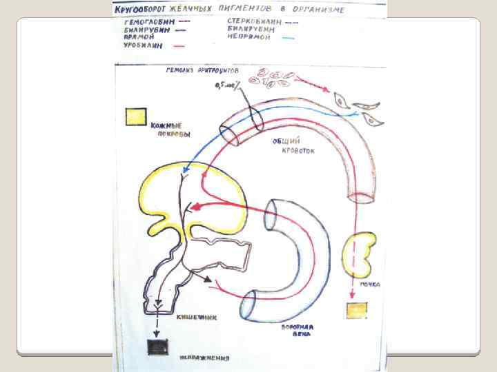 Печеночная (паренхиматозная) желтуха Клиника 7. Нарушения пигментного обмена: повышение уровня общего билирубина крови разной степени выраженности с преобладанием связанного билирубина; увеличение содержания желчных пигментов в моче за счет уробилиногена и билирубина (связанного); сохранение цветности окраски кала за счет образования стеркобилиногена.