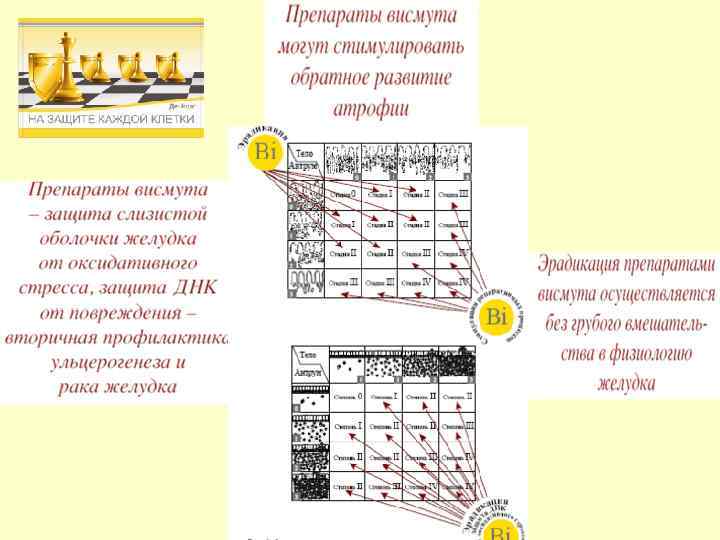 • Подавление ПОЛ и защита ДНК эпителия возможно с помощью “ловушки” свободных радикалов – препаратов на основе солей висмута. • Важно, что эффекты препаратов висмута реализуется без вмешательства в физиологию желудка и в регуляцию продукции соляной кислоты.