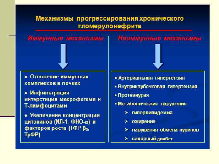Патогенез n Активация гуморальных медиаторных систем: комплемента, вазоактивных аминов (гистамина, серотонина), кининов, простагландинов приводит к повышению сосудистой проницаемости, лизису клеток, изменению свойств иммунных комплексов (ИК). n Гиперфильтрация, особенно в сочетании с повышенным транскапиллярным градиентом давления, ускоряет склероз в оставшихся клубочках.