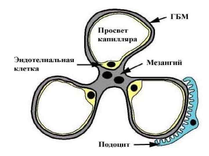 Капсула Шумлянского-Боумена Схема Строения Капилляров клубочка Париетальный эпителий Подоцит Эндотелиоцит Просвет капилляра Мезангиальный матрикс Фенестры эндотелиоцита Мезангиоцит Малые отростки подоцита
