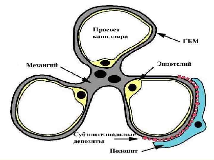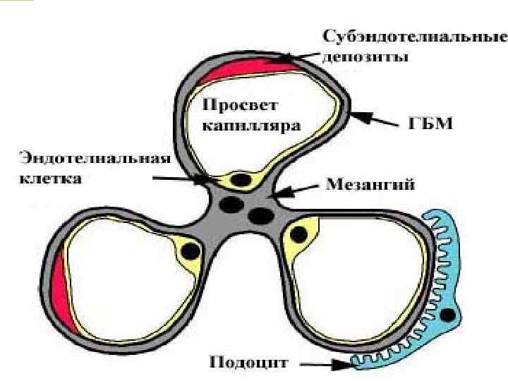 Патогенез n ЦИК откладывается на БМК и в мезангиуме, происходит n n n фиксация комплемента и развивается воспалительный процесс. Активированный иммунными комплексами комплемент, обладая хемотоксической активностью, привлекает в очаг поражения нейтрофилы. Освободившееся из лизосом полинуклеарные энзимы повреждает эндотелиальный покров БМК, что приводит к разрывам ее, появлению в мочевом пространстве белков плазмы, эритроцитов, фрагментов мембраны. Активированный комплемент способствует активации фактора Хагемана, агрегации тромбоцитов. В капиллярах клубочков происходит свертывание крови, отложение фибрина. Полинуклеары обладая фибринолитической активностью разрушают фибрин, часть фибрина остается в сосудах почек.