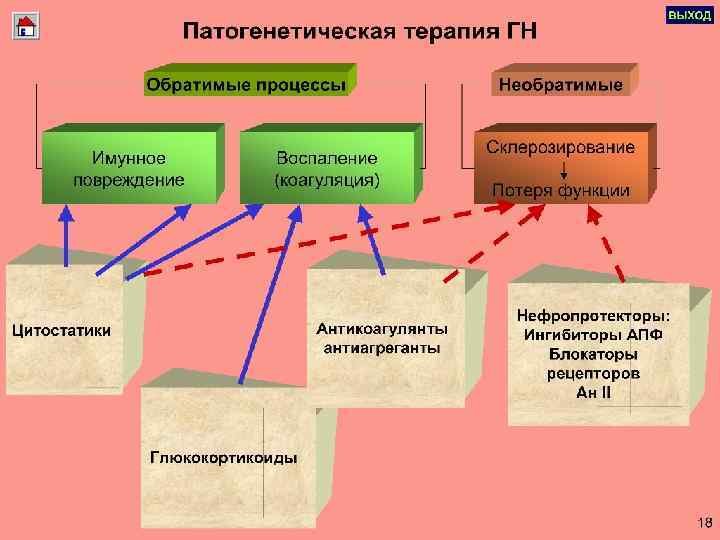 Лабораторно-инструментальная диагностика n Проба Нечипоренко: гематурия, цилиндрурия. n Проба Зимницкого: гипостенурия, изостенурия. Никтурия. n Радиоизотопная ренография - симметричное снижение фильтрационной и выделительной функции почек. n Экскреторная урография - симметричное уменьшение фильтрационной функции почек. n Биопсия почек: морфологические варианты поражения почек.