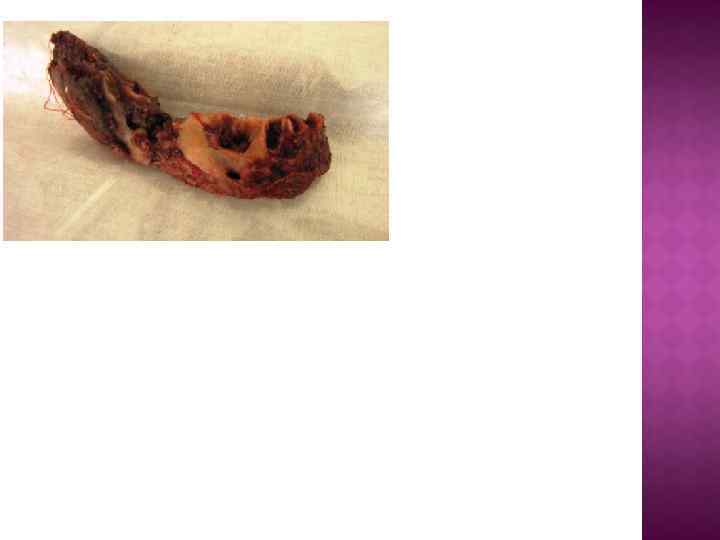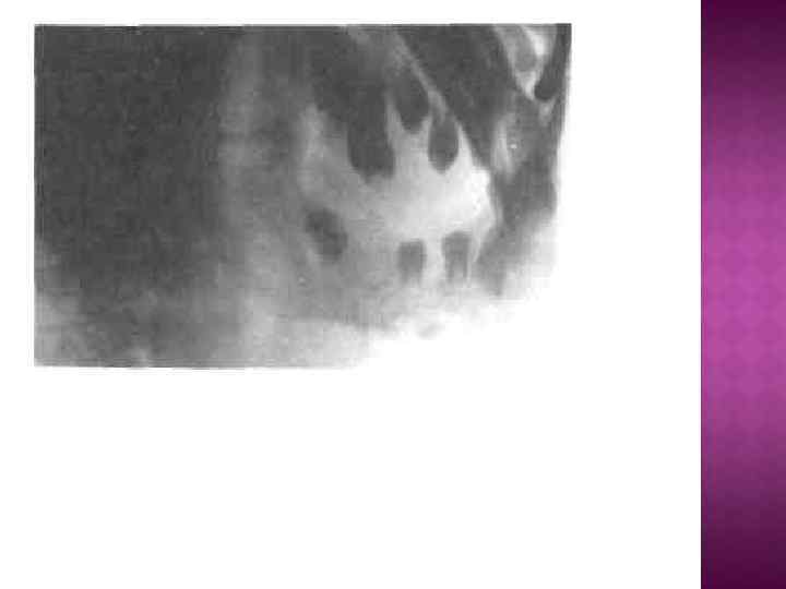 Клиника. • Общее состояние больного с хронической стадией остеомиелита челюстей продолжает улучшаться и не внушает серьёзных опасений • Температура тела снижается до нормы, но у отдельных больных в течение длительного времени она периодически повышается до 37, 3 37, 5 • Изменение конфигурации лица в результате инфильтрации окружающих челюсть мягких тканей и периостального утолщения кости • Кожа над утолщенной костью несколько истончена и натянута • Поражение ветви нижней челюсти обусловлено значительным уплотнением жевательной мышцы на стороне поражения и утолщением кости • На месте заживления операционных ран остаются свищевые ходы, идущие до кости, из которых выделялся гной, выбухают пышные легкокровоточащие грануляции • Ряд свищей рубцуется и втягивается внутрь • Лимфатические узлы уменьшаются, становятся плотными, менее болезненными при пальпации • При поражении угла и ветви НЧ открывание рта ограничено • В полости рта слизистая оболочка, покрывающая альвеолярный отросток и тело челюсти гиперемированная или синюшная, рыхлая, часто утолщенная