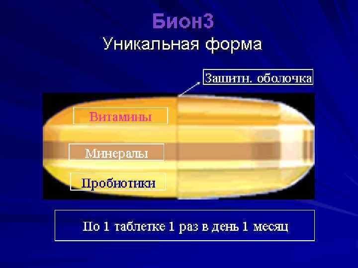 BION 3 (БИОН 3) эксклюзивный продукт с уникальной формой: трехслойная таблетка с оптимальным сочетанием 3 -х действующих веществ: ü Пробиотические культуры ü Важные микроэлементы ü Все жизненно необходимые витамины.