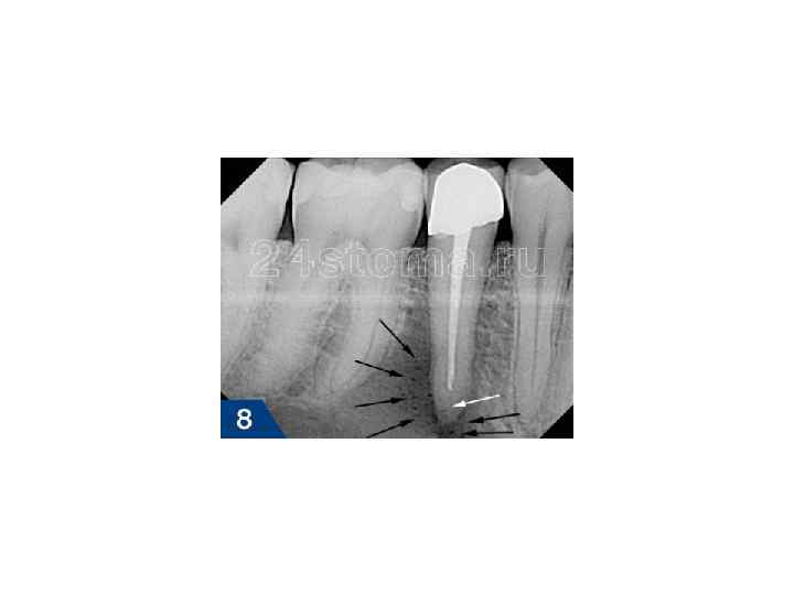 Диагностика • основывается на клинической картине, но чаще всего на рентгенологических данных. На рентгенограмме при гранулематозном периодонтите в околоверхушечной области виден округлый очаг разрежения костной ткани с четкими ровными границами. При правильно проведенном консервативном лечении на месте гранулематозного очага выявляют изменения, характерные для фиброзного периодонтита, или образование участка склерозированной костной ткани