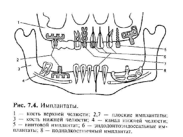 Имплантация зуба относится также к аллотрансплантации или эксплантации. Применяются титановые, реже циркониевые имплантаты. Имплантаты бывают пластиночными, винтовые(корневидные), поднадкостничные. Если имлантацию проводят при удалении зуба ее называют немедленной имплантацией.
