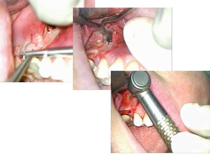 Хирургическое лечение • хронического периодонтита заключается в удалении зуба, реплантации, трансплантации, имплантации, резекции верхушки корня зуба, гемисекции, ампутации корня зуба.