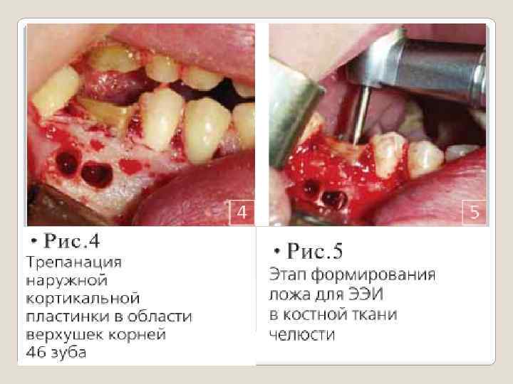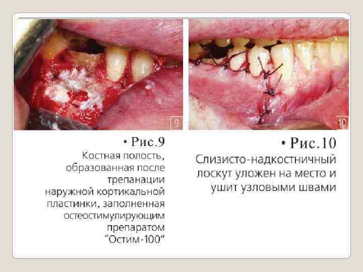 Отделив от кости с помощью распатора слизи-стонадкостничный лоскут, его оттягивают по направлению к переходной складке тупым или острым крючком, трепанацию наружной стенки зубной альвеолы производят крупными шаровидными, а также фиссурными борами. Обнажив таким путем окруженную грануляционной тканью верхушку корня, приступают к его удалению. Корневую верхушку следует спиливать фиссурным бором или торцовой фрезой, после удаления верхушки зуба выскабливают из полости грануляции и участки размягченной кости кюретажной ложкой