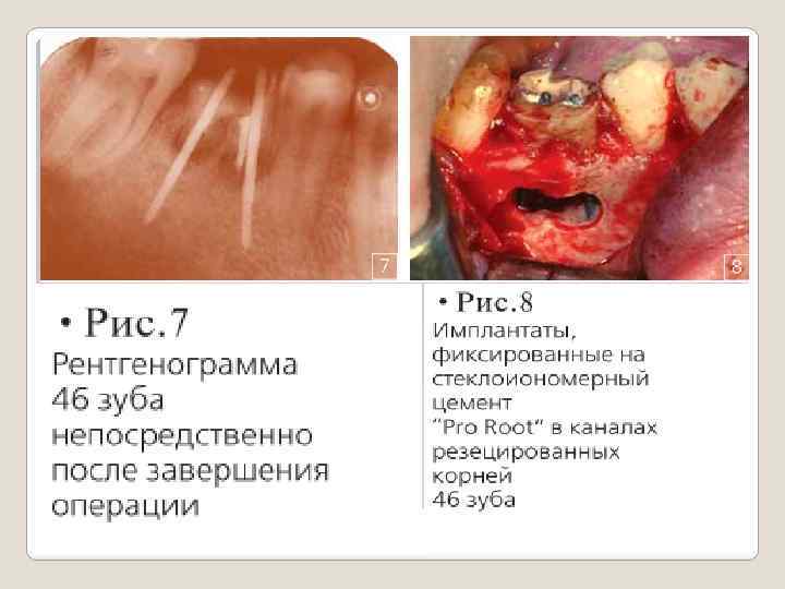 сошлифовав фрезой несколько наискось культю корня, небольшим шаровидным бором расширяют просвет канала, затем обратно-конусовидным бором или ультразвуковой насадкой формируют в культе полость, выполняют ее серебряной амальгамой, стеклоиномерным цементом, МТА цементом, вводя небольшими порциями и конденсируя инструментом