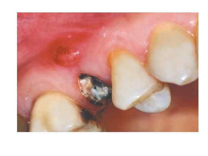 Гранулирующий периодонтит • В результате обострений воспалительного процесса гранулирующий очаг в периодонте постепенно распространяется на новые участки альвеолы, в основном в сторону преддверия рта, что приводит в некоторых случаях к образованию узур в компактной пластинке альвеолярного отростка. Отток гноя и прорастание грануляций способствуют возникновению свищевого хода. Иногда гранулирующий очаг распространяется в прилежащие мягкие ткани, образуя поднадкостничную, подслизистую или подкожную гранулему. После их вскрытия остаются свищи, в том числе на коже лица.