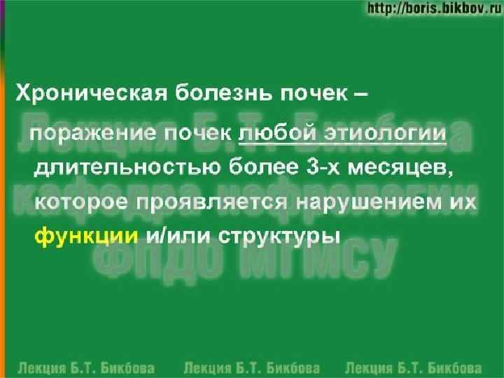 Хроническая почечная недостаточность n симптомокомплекс, вызванный необратимой гибелью нефронов при первичных или вторичных хронических заболеваниях почек