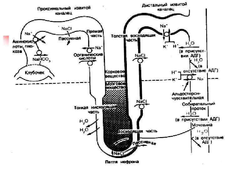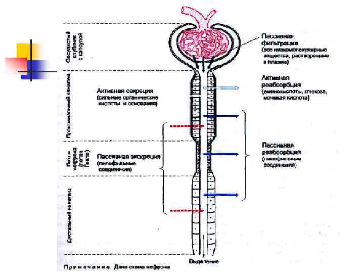 n n n Большая часть (85%) нефронов расположена в корковом веществе почки. Канальцы нефронов образуют петлю, проникающую из коркового вещества в мозговое. Также в мозговом веществе расположены выводящие канальцы, по которым моча выводится в почечные чашечки. Мозговое вещество образует так называемые «пирамиды» , вершины которых заканчиваются сосочками впадающими в чашечки. На уровне сосочков происходит объединение всех почечных канальцев, по которым выводится моча.