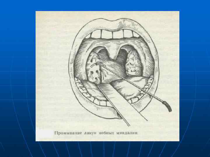 Лечение хронического тонзиллита Местное лечение: n Полоскание растворами антисептиков, антибиотиков и смазывание миндалин различными растворами мало эффективно. n Введение лекарств в околоминдаликовую ткань и выдавливание содержимого лакун недопустимо. n Расщепление лакун и гальванокаустика не эффективны. n Криотерапия (опасность отека гортани, асфиксии). n Тонзилор. n Промывание лакун миндалин.