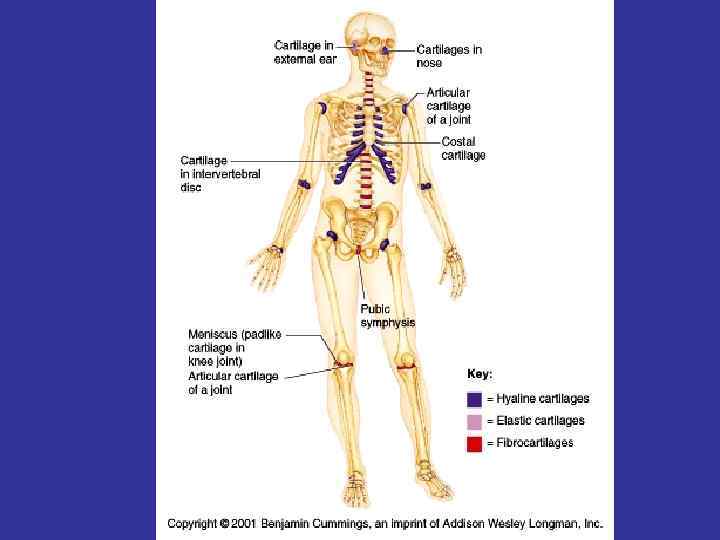 • Хондроциты - имеют больший размер и овальную форму. Они лежат в особых полостях межклеточного вещества – лакунах. Хондроциты часто образуют т. н. изогенные группы из 2 -6 клеток, которые произошли из одной клетки. При этом некоторые хондроциты сохраняют способность к делению, а другие активно синтезируют компоненты межклеточного вещества. За счёт деятельности хондроцитов происходит увеличение массы хряща изнутри - интерстициальный рост.