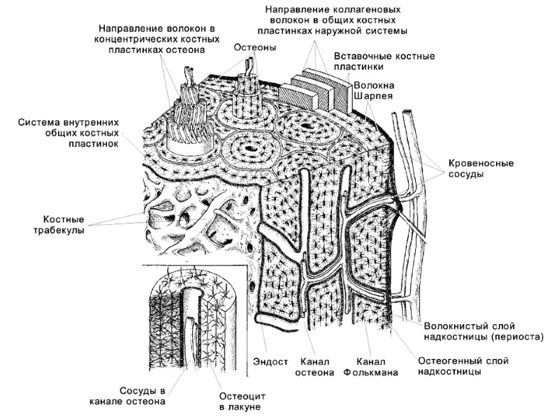 ПЛАСТИНЧАТАЯ КОСТНАЯ ТКАНЬ элементарный структурный блок – костная пластинка структурные образования более высокого уровня: а) остеоны б) генеральные пластинки в) трабекулярные пакеты компактное вещество губчатое вещество