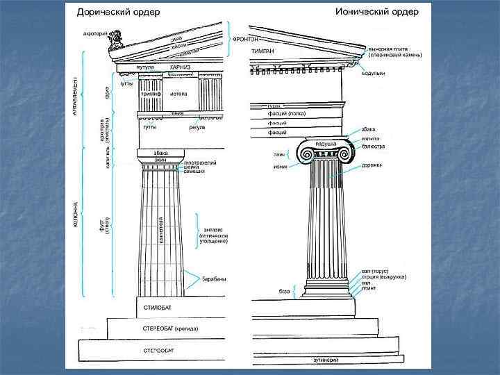 Ионический ордер Характерные черты : Ионический ордер отличается от дорического ордера большей лёгкостью пропорций и декором всех его частей. Отличительной чертой ионического ордера является способ оформления капители, которая выполняется в виде двух противоположно расположенных волют. Ионический ордер во времена античности считался „женским” ордером, за счет своей утончённости, изысканности и дополнениями разнообразными украшениями. Колонна ионического ордера, в отличие от дорического делится на три части: основание, ствол и капитель. База . часто сама опиралась на квадратную в плане плиту — плинт. Выпуклые элементы базы — полувалы, или торусы, украшались орнаментальной порезкой или горизонтальными желобками, по смыслу аналогичными каннелюрам. Скоции — вогнутые элементы — обычно оставались гладкими.