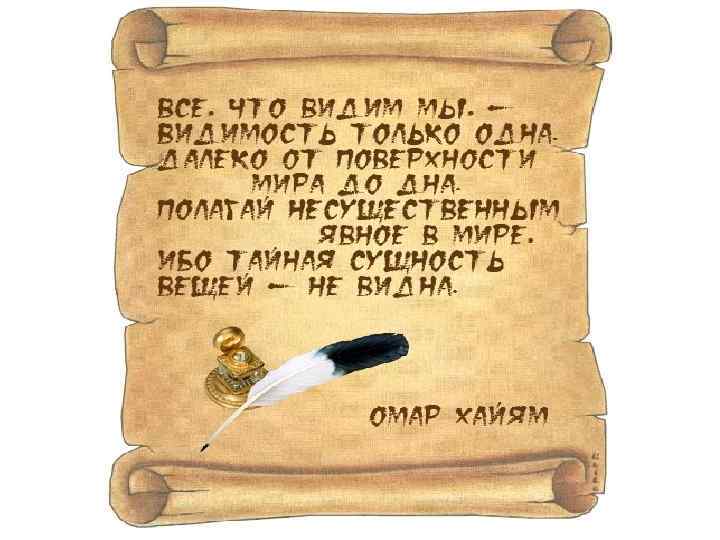 Персидскую и таджикскую поэзию нельзя представить себе без творчества Омара Хайяма (ок. 1048 – 1131), поэта, философа, математика, астронома, астролога. • Его четверостишья (рубаи) отличаются изяществом, глубиной философской мысли, яркими запоминающимися образами, особой музыкальностью и ритмичностью. Это раздумья над Кораном, поиски духовных основ бытия.