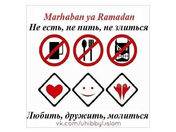 Второе Свидетельство Веры: 1. Саум (пост) в Священный праздник Рамадан Полный отказ от простых человеческих нужд даже в самые жаркие и изнурительные дни дает возможность мусульманам продемонстрировать силу своей веры. Во время поста мусульмане стремятся обуздать свои инстинкты и страсти. Помимо внешней чистоты в этот месяц постящийся старается строже соблюдать чистоту внутреннюю — освобождение от всех мыслей и действий, оскверняющих человека. Мусульмане считают, что соблюдение духовного и телесного поста в месяц Рамадан чрезвычайно позитивно воздействует на их души. В течение месяца Рамадан правоверные мусульмане в дневное время отказываются от приёма пищи, питья, курения и интимной близости.