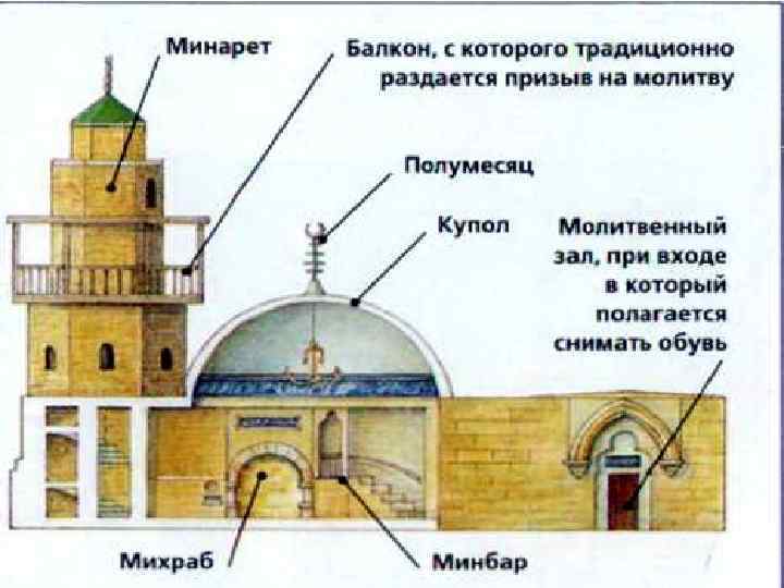 Мечеть • Место для совершения земных поклонов. Представляет собой прямоугольный двор, окруженный галереями, и многоколонный молитвенный зал. • Квадратный двор или зал, окруженный галереями на столбах или колоннах, перекрытия на стрельчатых или подковообразных арках