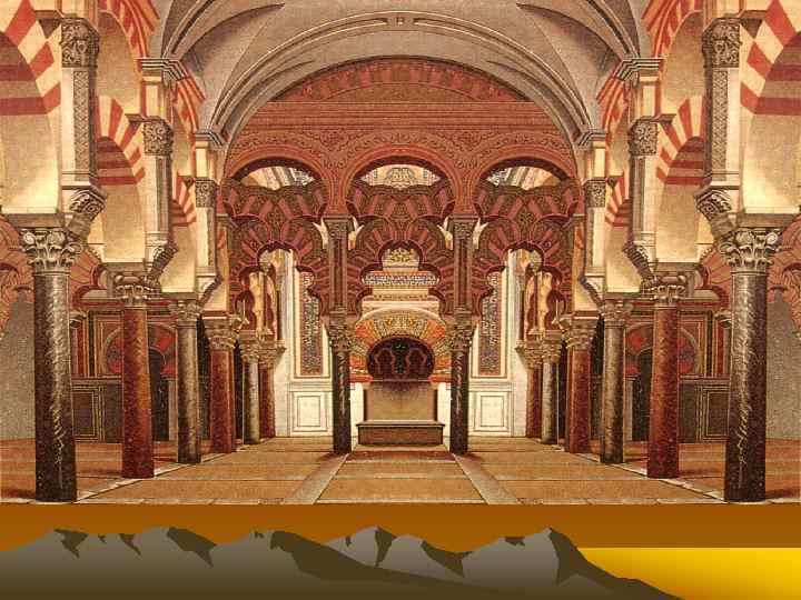 Соборная мечеть Омейядов в Кордове (Испания) Зал с 600 колоннами, образующими 19 нефов. Колонны из разноцветного мрамора, яшмы и порфира не имеющие базовой основы.