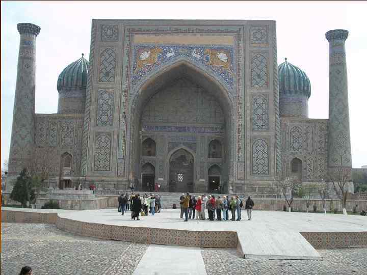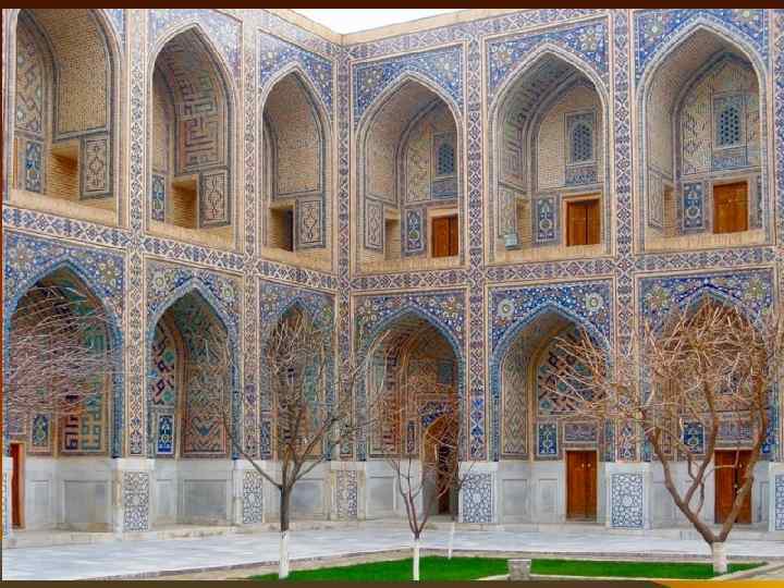- Газель – древняя стихотворная форма восточной лирической поэзии, создателем которой считается Хафиз. Состоит из 5 – 12 двустиший с однозвучной рифмовкой первых двух строк, затем через строку. - Касыда – жанр восточной лирической поэзии, напоминающий античную оду своей торжественностью, назидательностью, хвалебностью. Этот жанр использовал в своем творчестве гератский поэт, мыслитель XV в. Алишер Навои и др. - Рубаи (араб. «учетверенный» ) – четверостишия в поэзии народов Востока, содержащие философские идеи о человеке, смысле жизни, любви, красоте. Общепризнанным мастером рубаи считается Омар Хайям. Диван (перс. «запись» , «книга» ) – в классической литературе Востока сборник стихотворений одного поэта. Стихотворения располагались по определенным правилам градации жанров (касыды, газели, марсийа, кит’а, рубаи и т. д. ). Литературные жанры восточной поэзии Самарканд. Медресе Тилля-Кори