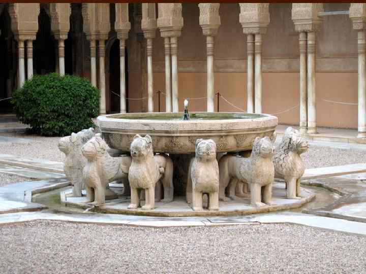 Основу композиции Альгамбры расположенных на разных уровнях. составляет система дворов, Главные из них – Миртовый и Львиный – представляют собой замечательный пример соединения архитектуры и садово-паркового искусства. Середину Миртового двора занимает гладь водоёма, по краям которого поднимаются кроны двух рядов миртовых кустов. Именно тень и вода, два непременных элемента исламского сада, играют очень важную роль в общей композиции.
