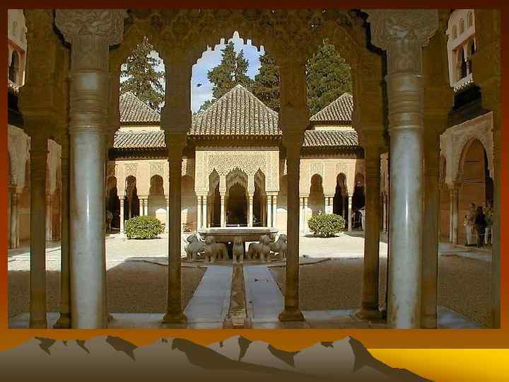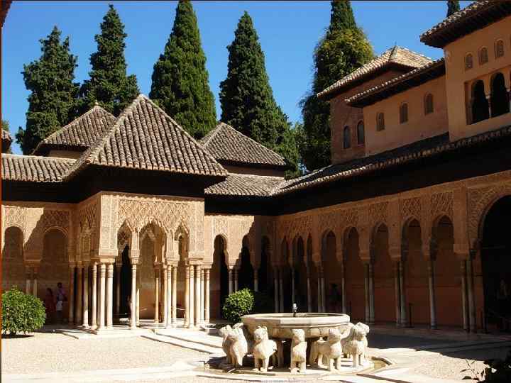Дворец Альгамбра в Гранаде (XIII-XIV вв. Южная Испания) Альгамбра — архитектурный комплекс мавританского периода, состоящий из мечети, дворца и крепости. Он располагается в южной Испании в восточной части города Гранада. Альгамбра состоит из крайне запутанного лабиринта внутренних помещений, двориков и садиков,