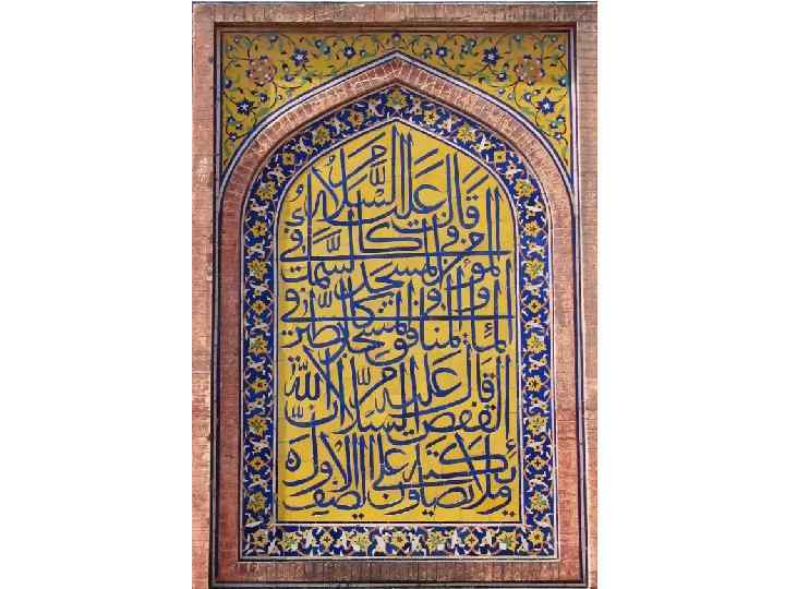 По законам шариата изображать человека и животных было запрещено, поэтому особую роль в декоративном оформлении играл орнамент: – арабески (бегущая лоза); – раппорт геометрический (композиция сложно переплетенных лент, как в калейдоскопе); – раппорт эпиграфический (стилизованная надписьизречение из Корана). Эпиграфический раппорт Тадж Махала.