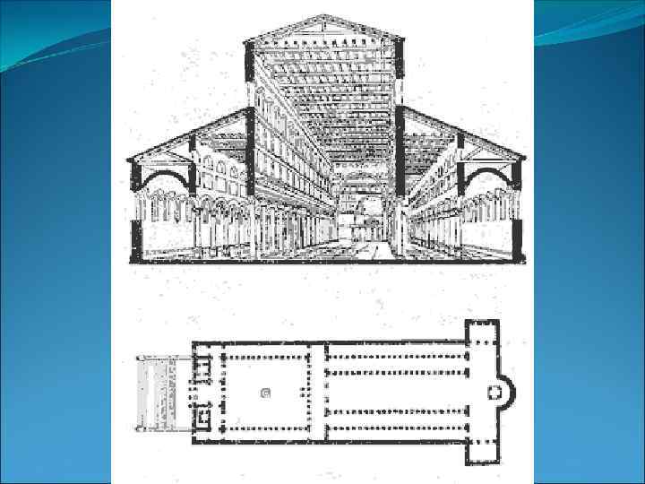 Строились церкви двух основных типов: базилики и крестовокупольные церкви Базилики представляли собой прямоугольные, вытянутые в длину здания, разделенные на продольные помещения — нефы, из которых средний был выше боковых. Часто они пересекались широким поперечным нефом, образуя в плане вытянутый, так называемый латинский крест. В восточной части базилики находился алтарь.