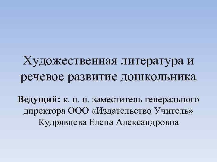 Художественная литература и речевое развитие дошкольника Ведущий: к. п. н. заместитель генерального директора ООО «Издательство Учитель» Кудрявцева Елена Александровна