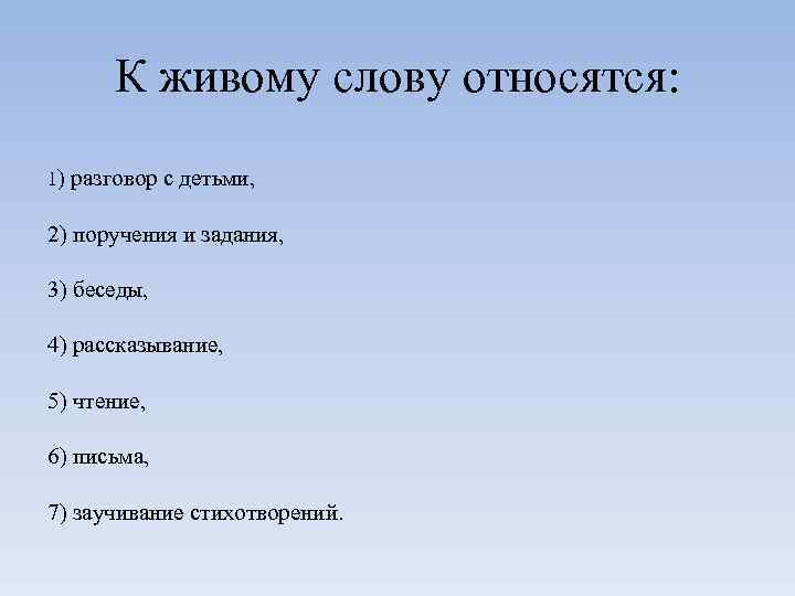 К живому слову относятся: 1) разговор с детьми, 2) поручения и задания, 3) беседы, 4) рассказывание, 5) чтение, 6) письма, 7) заучивание стихотворений.